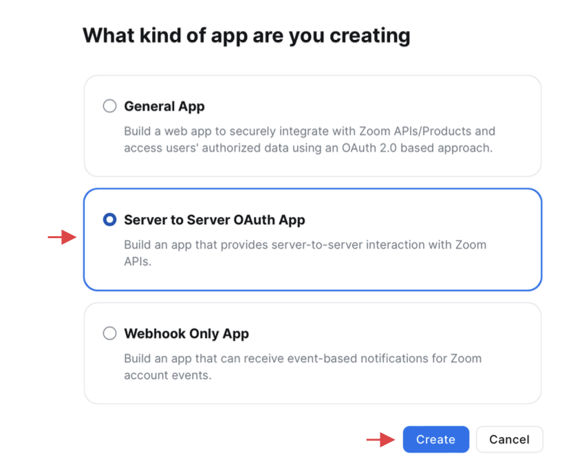 Step 3: Click ‘Server to Server OAuth App’ and select ’Create’