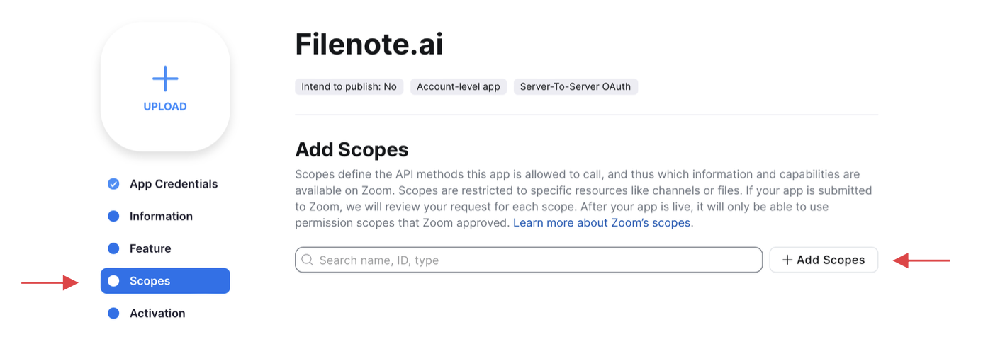 Step 7: Click on “Scopes” on the left hand side and then “Add Scopes”
