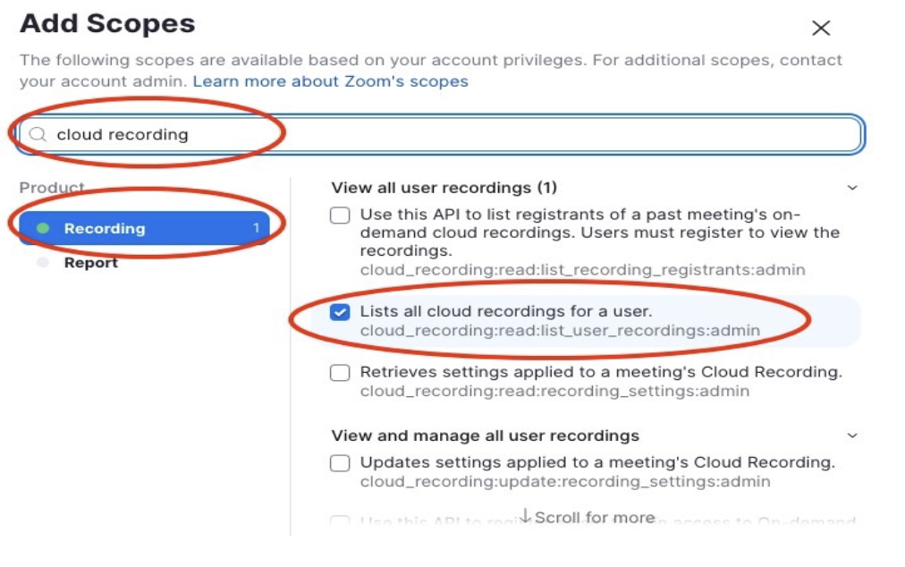 Search for “cloud recording”, select “Lists all cloud recordings for a user” as per the screenshot: