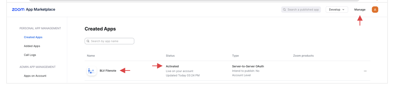 Step 10: The app is now activated. To verify you have activated, you can check it via “Manage”: