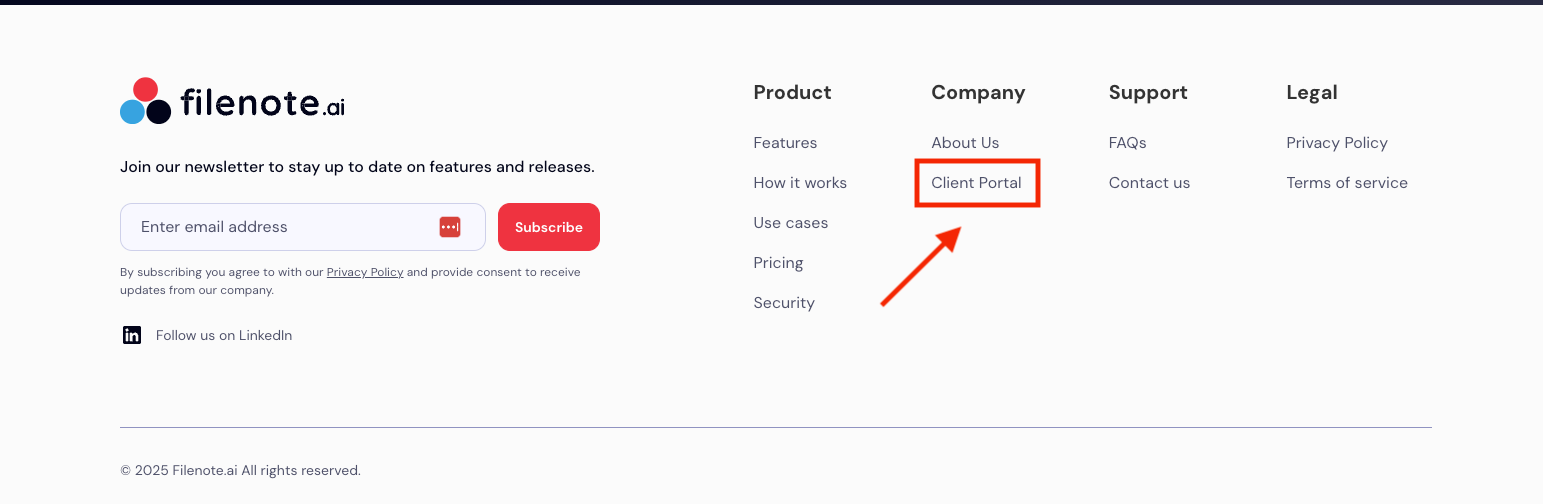 - scroll to the bottom of filenote.ai website and click on "Client Portal"