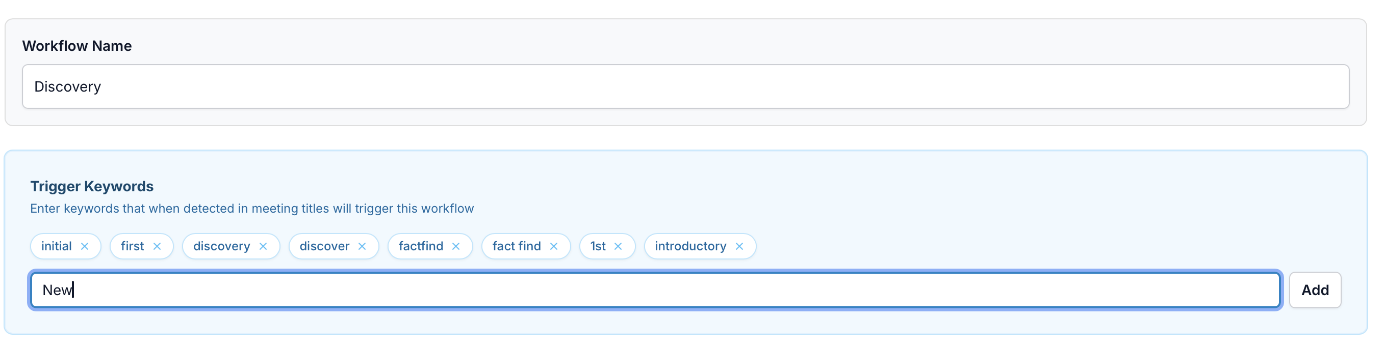 You don't need to match the meeting title exactly—just one unique keyword is enough! If your meeting is called "Jones Discovery Session," simply having Discovery as a keyword in your workflow will do the trick.