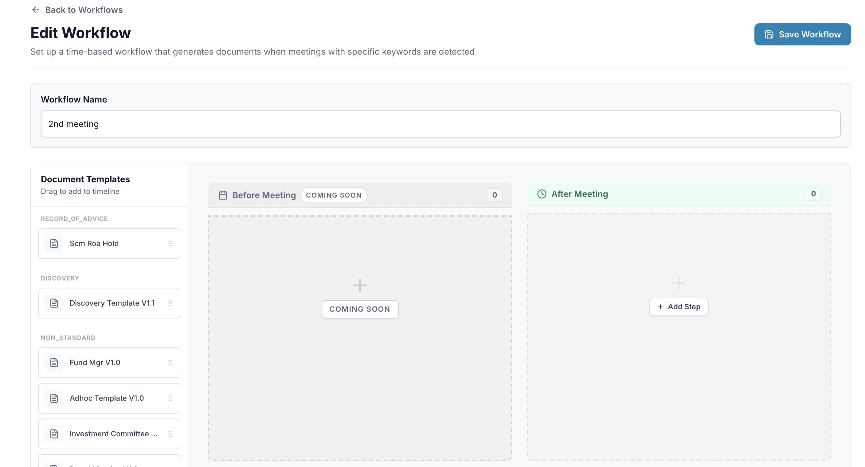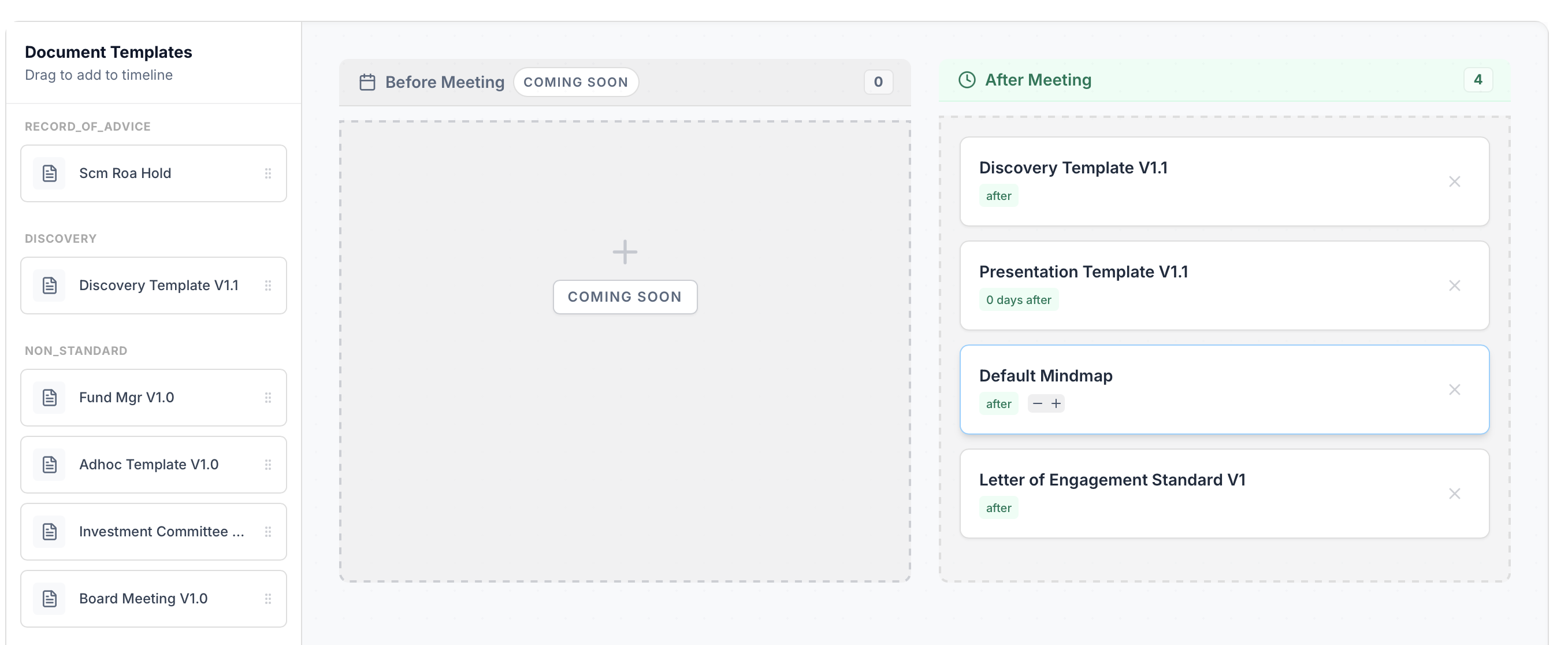 Map Templates: Drag and drop your desired documents from the Document Templates list into the After Meeting section. This ensures the right outputs are generated for that specific meeting type.